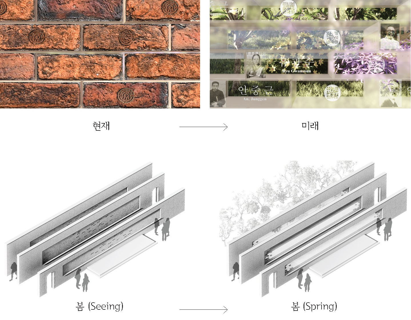 벽돌 벽에 듬성듬성 박혀 있는 199개의 투명한 유리블록은 어두운 벽 사이공간에 빛이 투과되면 영롱하게 빛난다. 하지만 유리블록 뒤로 비치는 아름다운 추모동산의 꽃나무를 한눈에 보기에는 아직 부족하다. 여전히 그늘진 벽과 벽 사이공간은 답답하고 방문객은 좁은 길 양 끝으로 오직 사형장과 옥사만 볼 수 있다. 이는 방문객들로 하여금 하루빨리 이 벽을 전부 투명하게 바꾸고 싶게 만든다. 추후 추가 발굴이 진행됨에 따라 불투명한 벽돌벽에 유리블록으로 이뤄진 커다란 투명 창이 생긴다. 이 투명 유리블록 창은 그 너머의 아름다운 추모동산을 담아낸다. 이는 돌아가신 독립운동가들이 염원하였을 봄의 풍경이다.